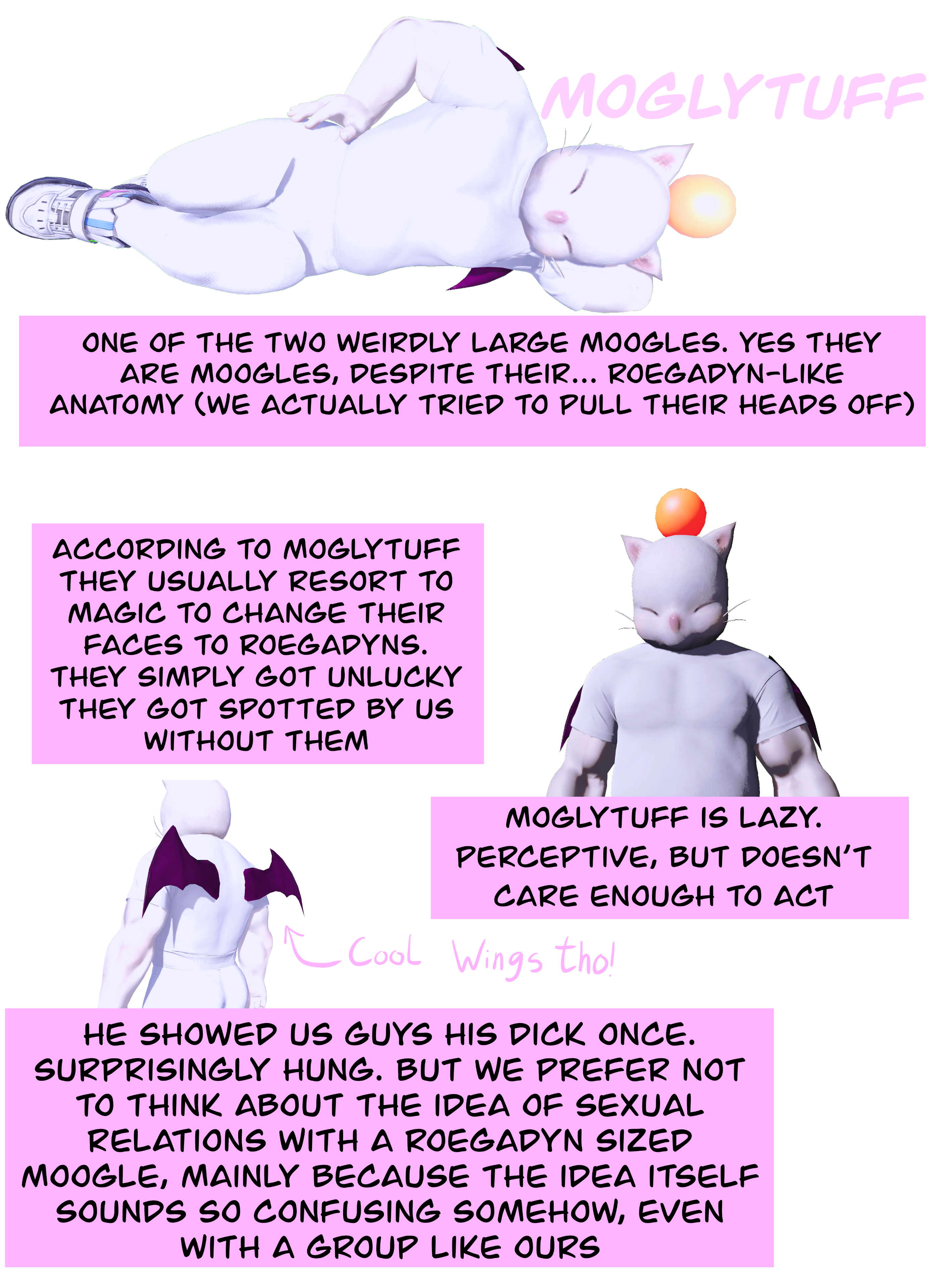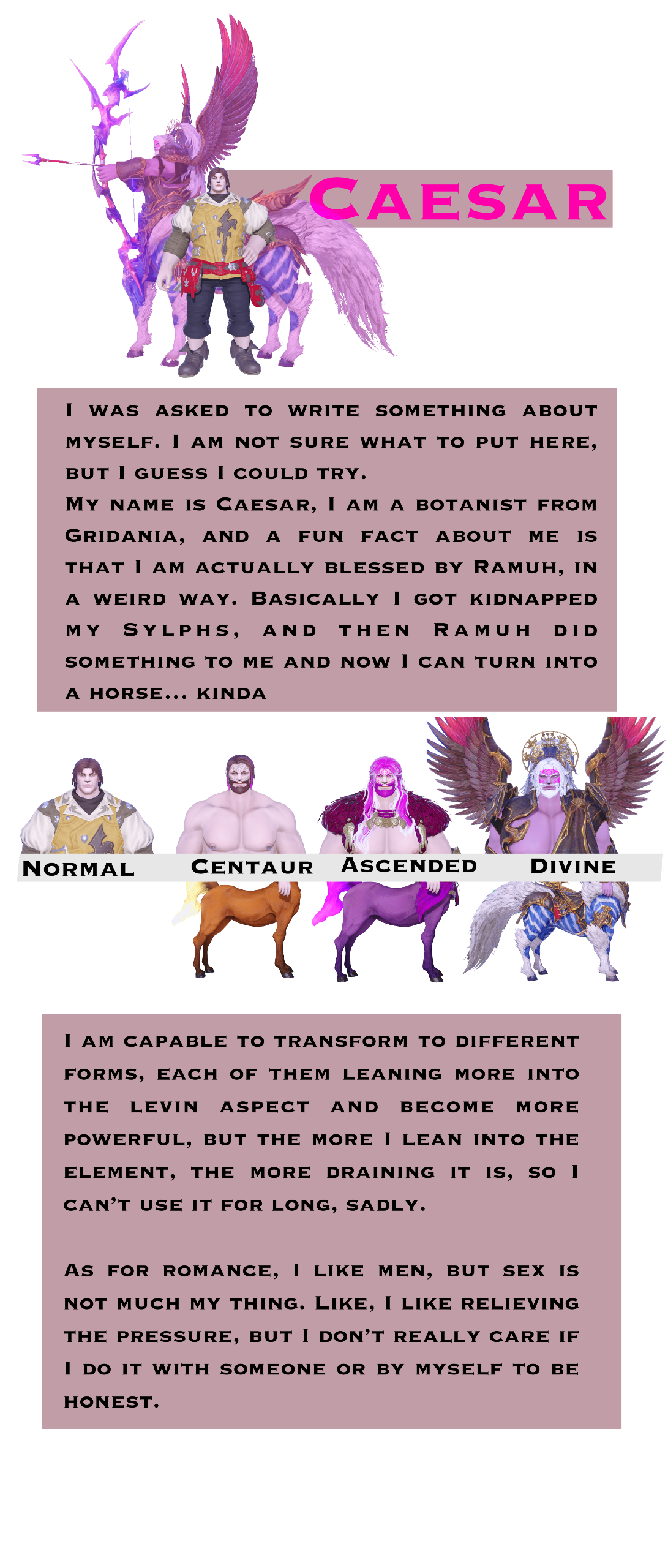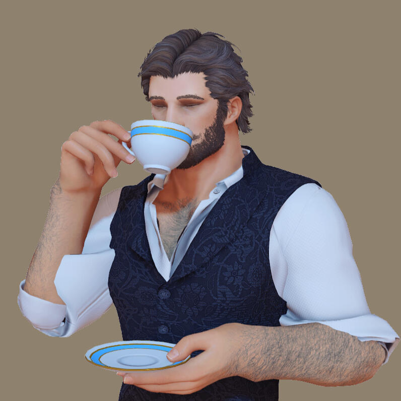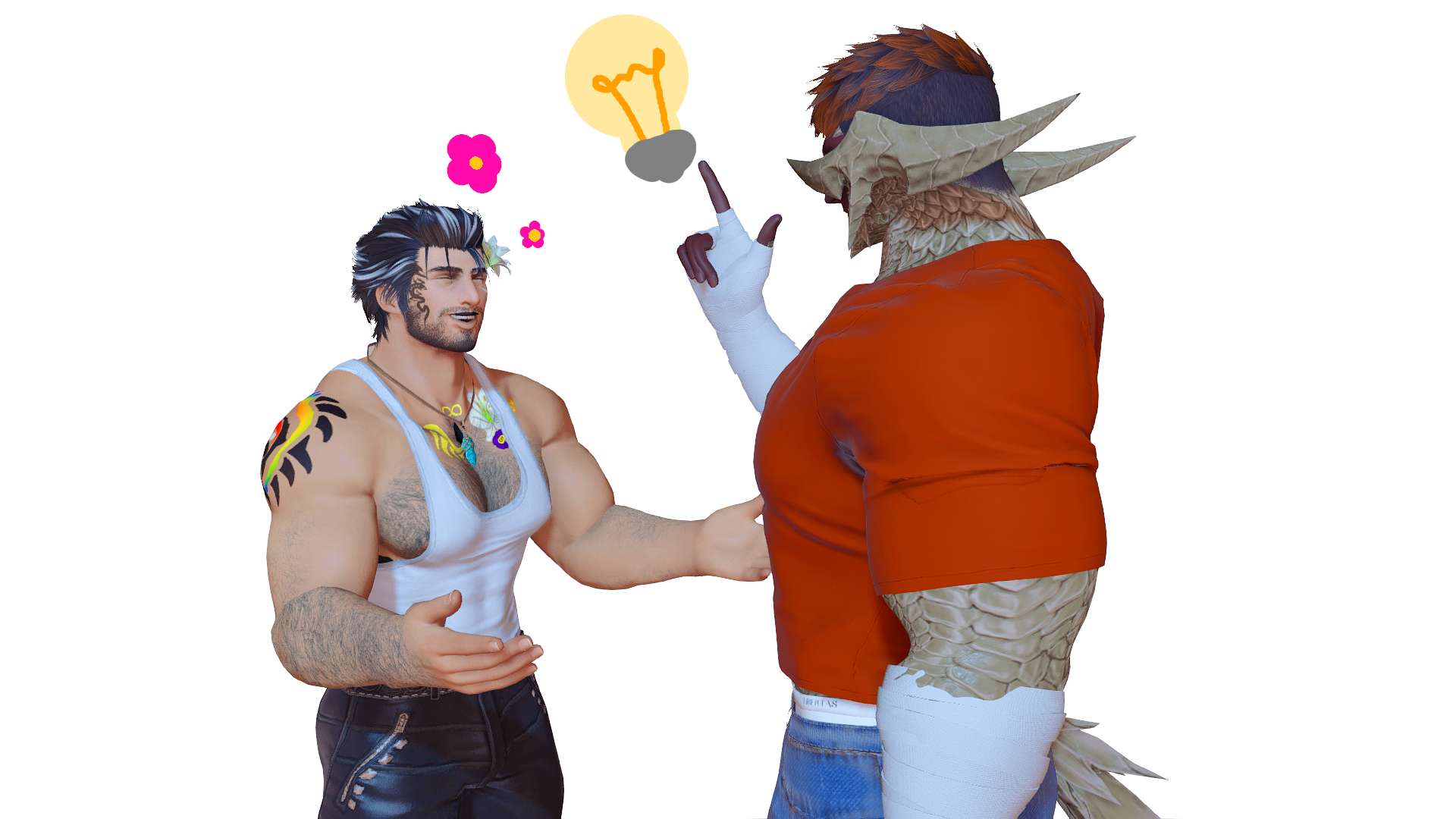 Atlas was once a reckless young adult, wishing for stardom, and he used the one thing he could count on: his body. And thus he began his fighter career in Ul'dah's coliseum. His furious barrage of punches earned him many a victory, and eanred him a reputation of a dreaded fighter. However, fighting takes a toll on the body, and once his body began to give out, he was forced to retire, which let him to become much less careful with his shape, and got lazier, but is still the same cheeky guy.
