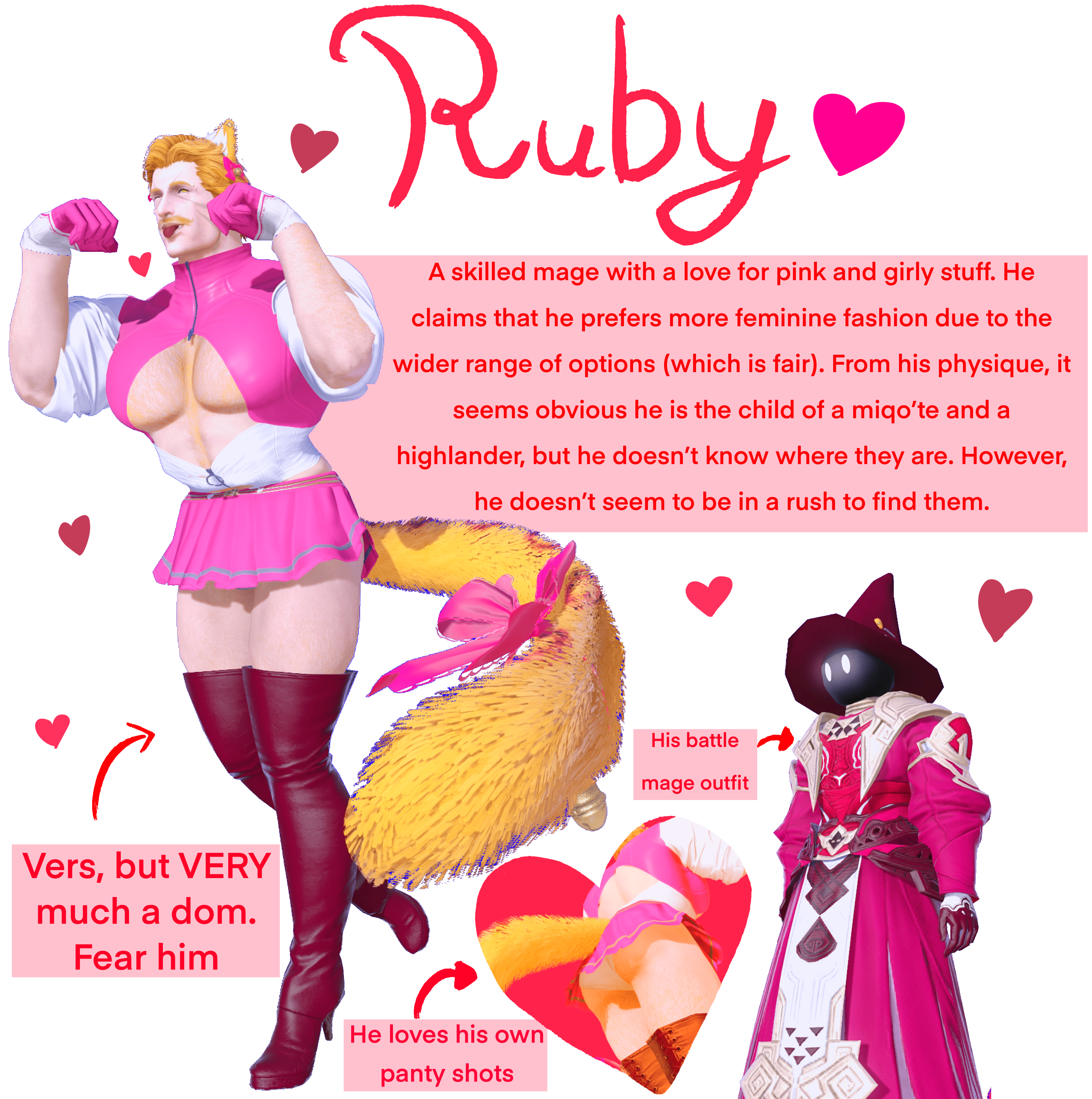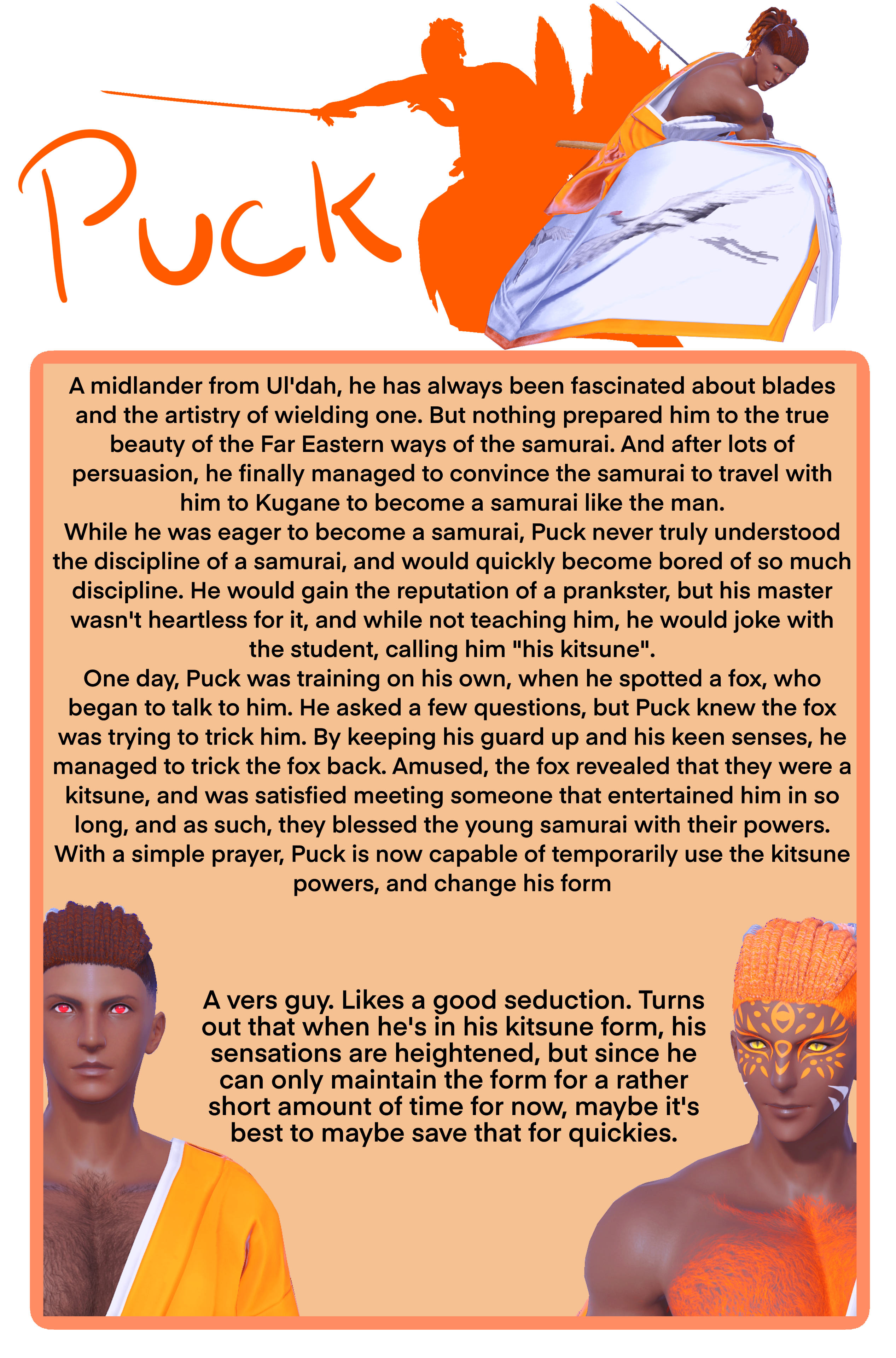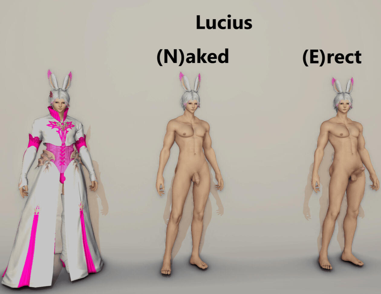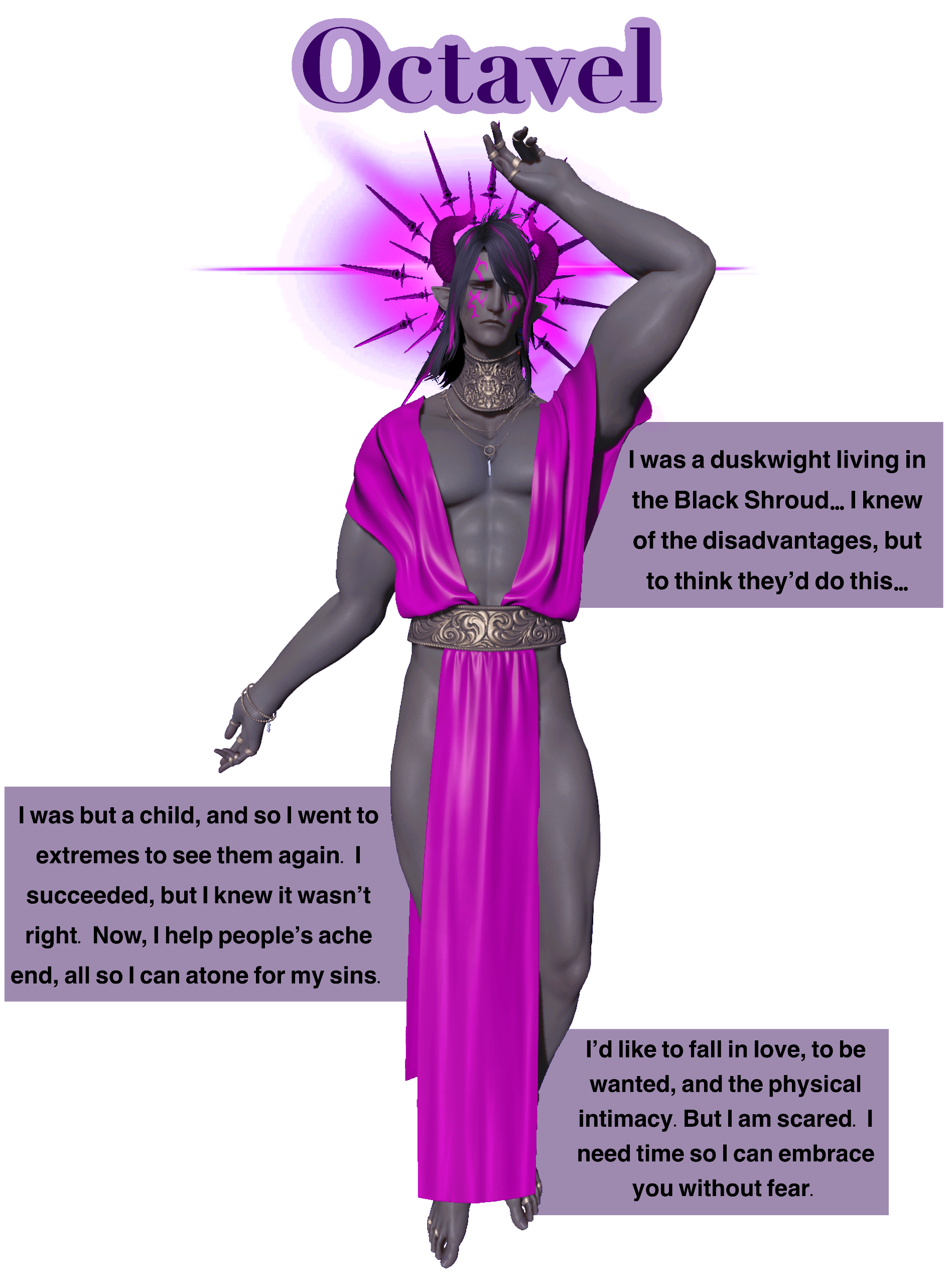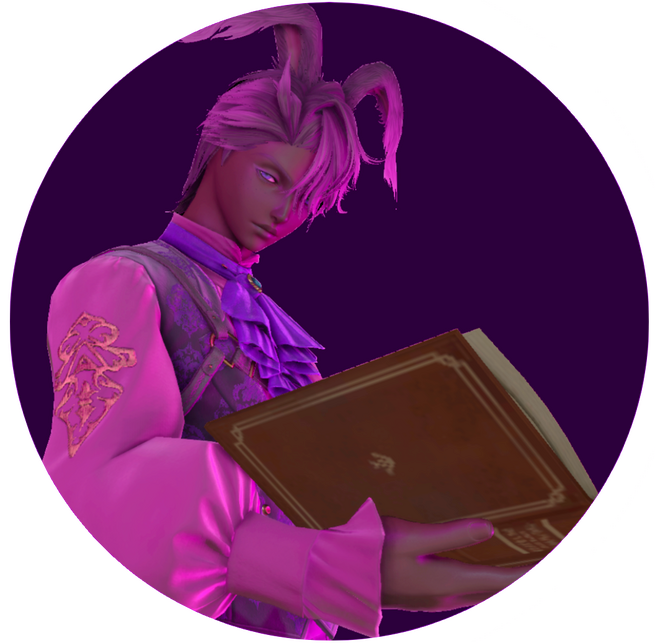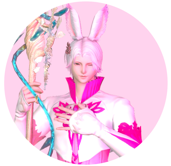 Lucius was born of the church, and raised by the church. Sadly, he was considered to be the "black sheep". It didn't help that he was a viera in Ishgard, but discovering his sexuality and questioning the church's doctrine and its darker shadows made his childhood quite difficult. Once he reached 18, he was banned from the city for "heresy". Dissatisfied with the sorry state of the church, he decided to research about the Twelve. He learned about Menphina, her message, and began following her teachings, calling himself the Priest of Eros, whose mission is to heal the worlds through pleasure. He accepts followers and students of this path gladly.