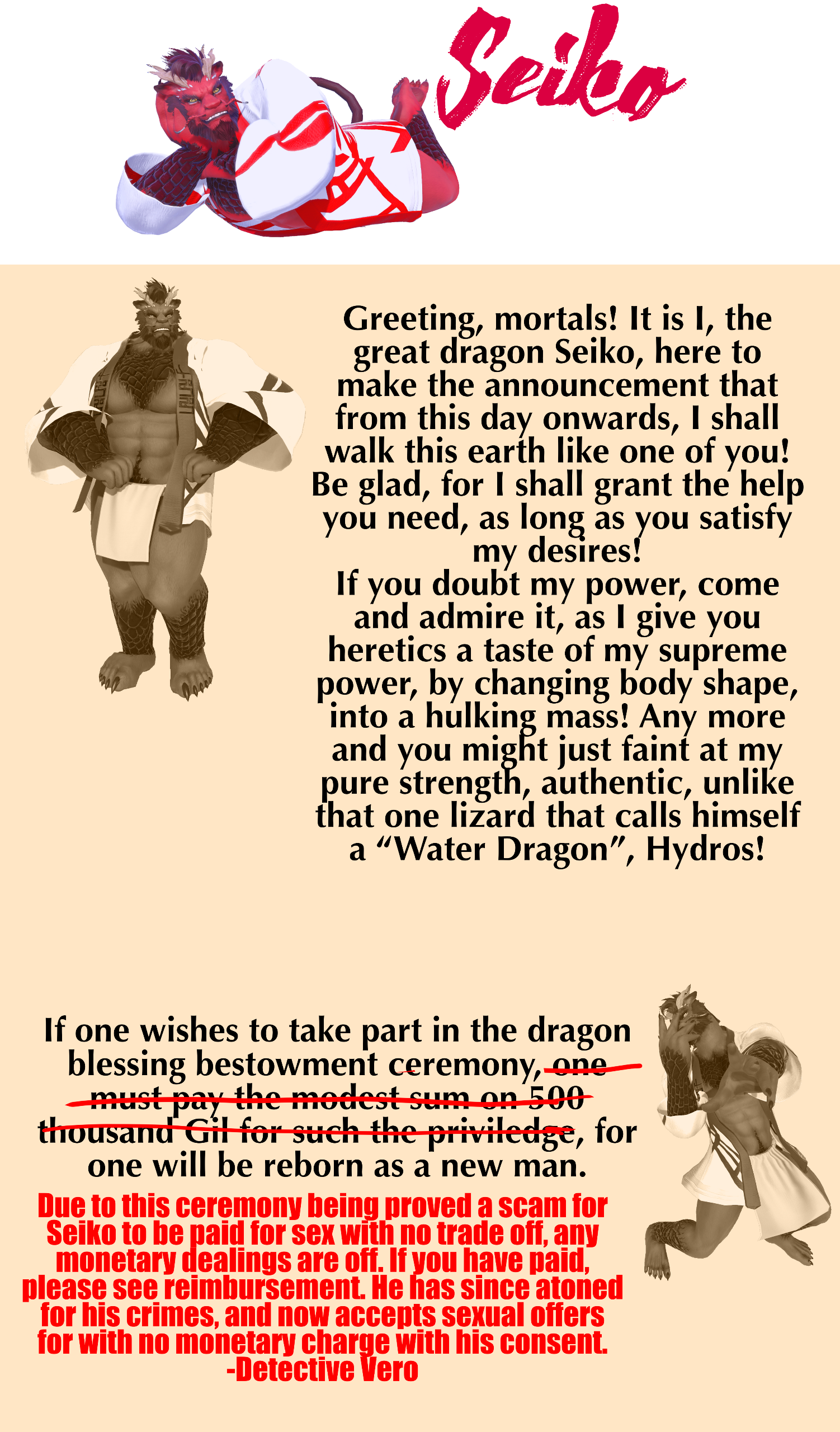 A water dragon, who loves to swim in the seas. Though nowhere near the age of even Vrtra, he still has at the very least many centuries to his name. Seeing the greed of the living, he firstly exiled himself beneath the seas for a couple few centuries. However, his desire for connection and craving to see the world got the best of him, and this he mastered a way to give himself the shape of an Au ra, although his size could not be diminished enough.